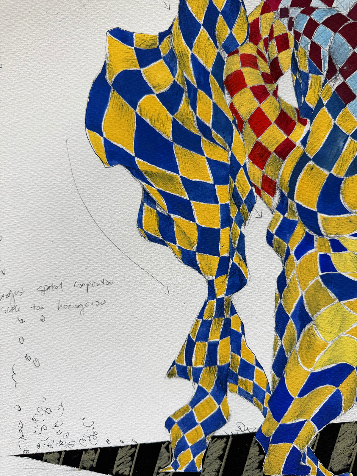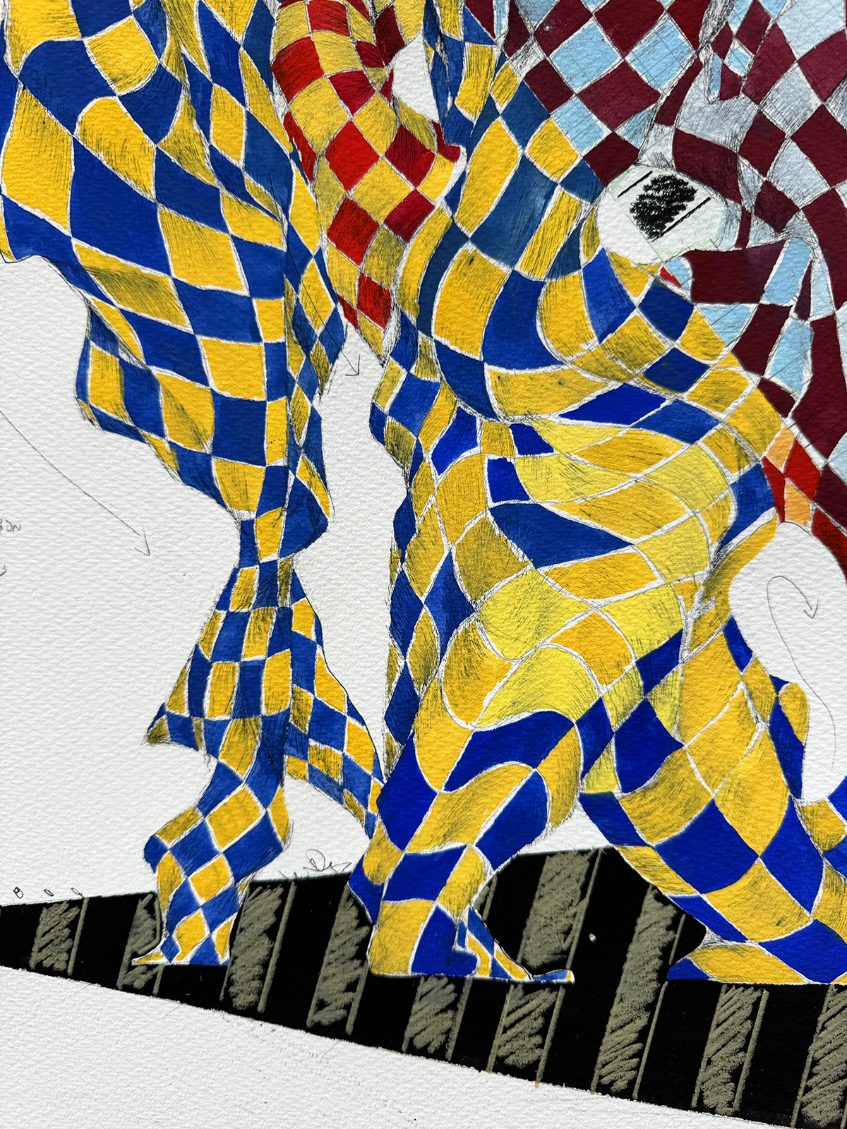 2025. 30" x 22". Pen, gouache, stabilo pencil, pencil, colored pencil.