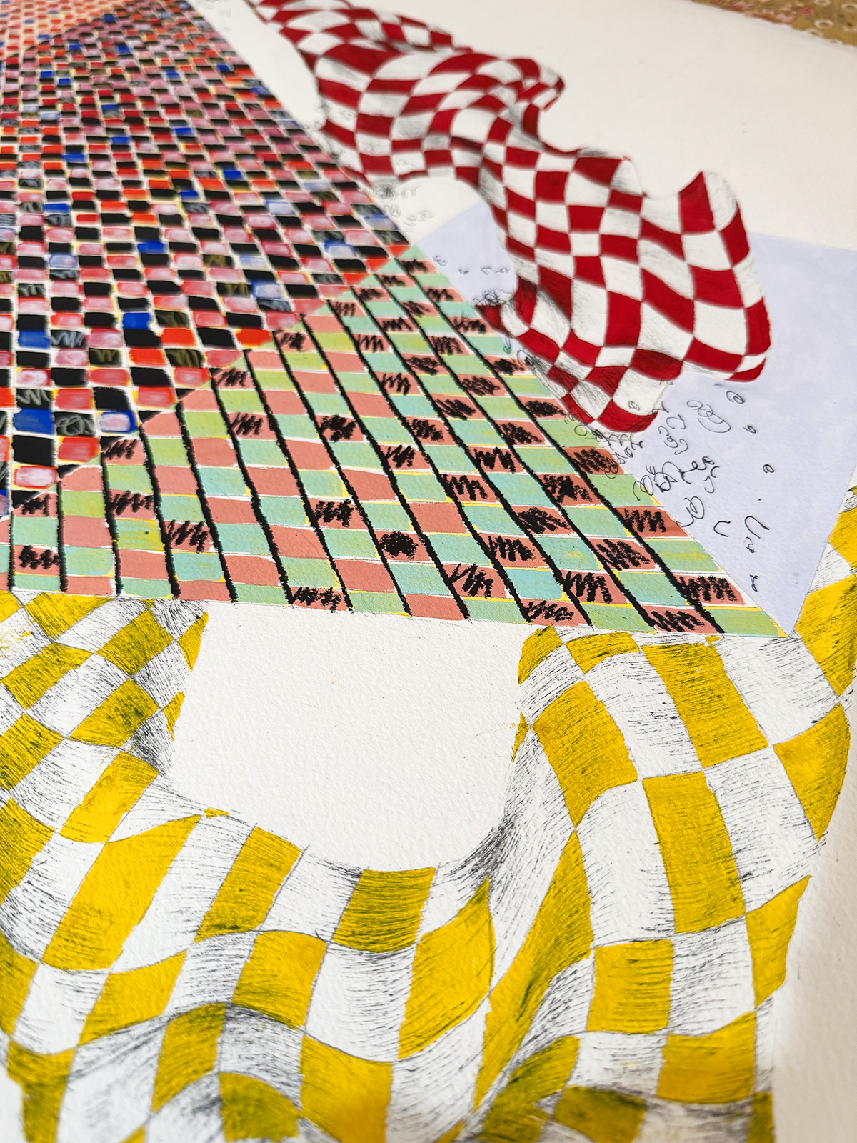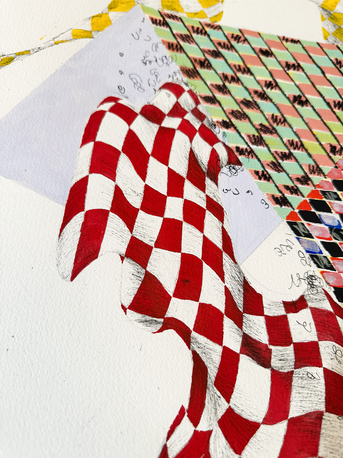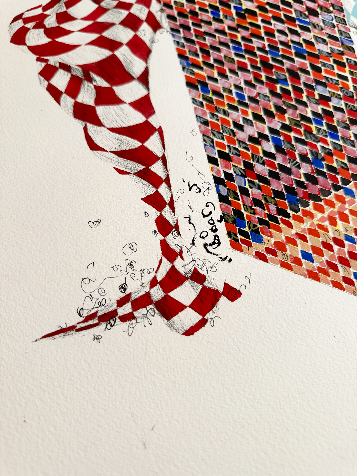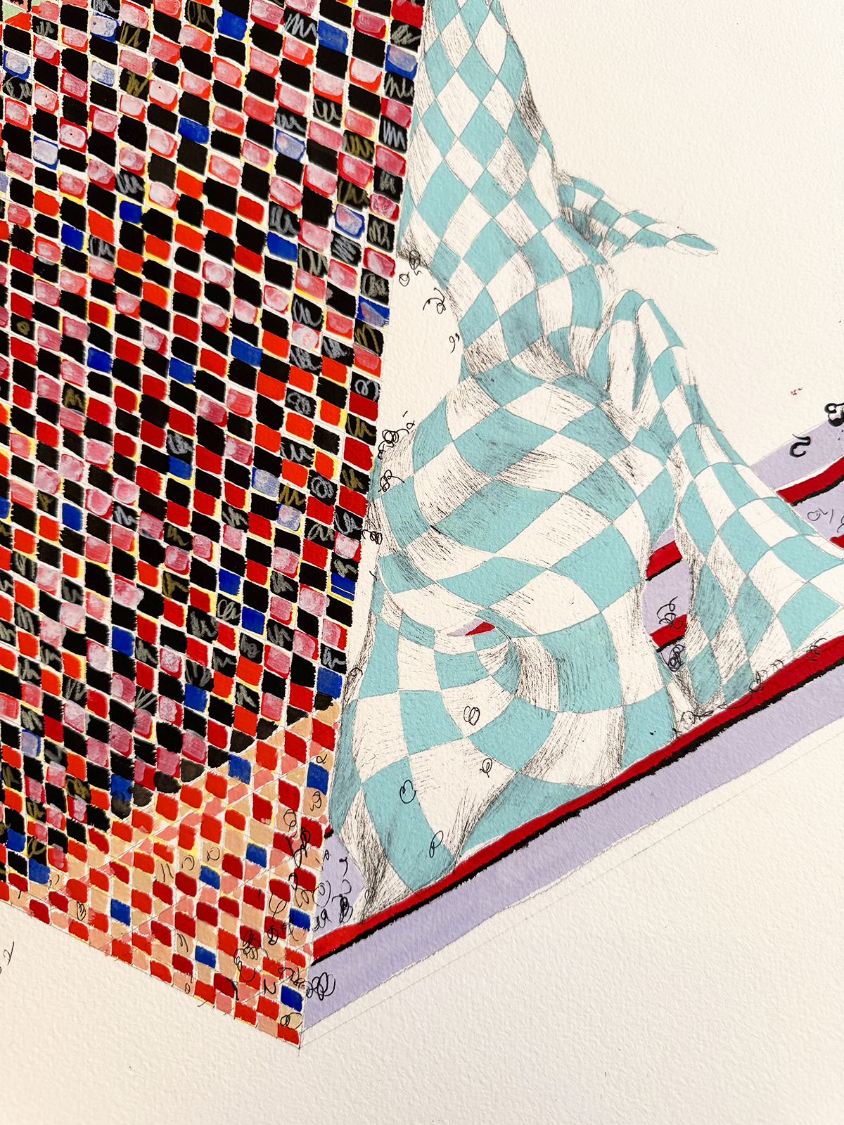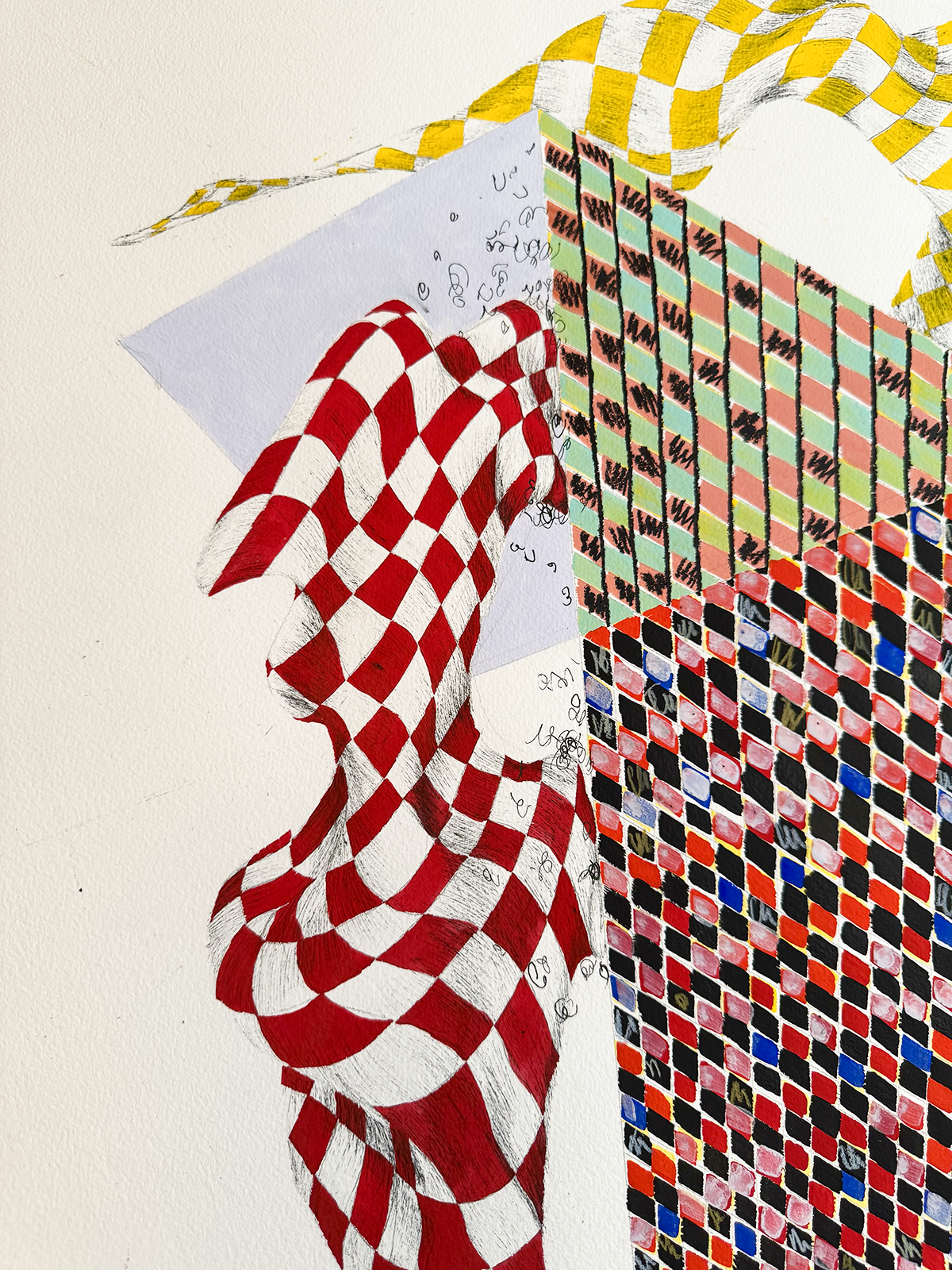2025. 22"W x 30"H. Pen, gouache, stabilo pencil, colored pencil, pencil.
